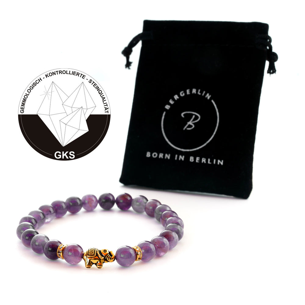 Amethyst ist ein Mineral, das seit Jahrhunderten für die Herstellung von Schmuck verwendet wird, und seine wunderschönen violetten Farbtöne sind eine atemberaubende Ergänzung für jede Garderobe. Funkelnder Amethyst lässt sich besonders am Armgelenk bequem tragen – und kann jeden Beobachter durch sein spezielles Funkeln in den Bann ziehen. BERGERLIN Armbänder werden ausschließlich aus echten Edelsteinen hergestellt. Bei uns findest du hochwertige Armbänder, die auch nach Jahren mit Hochwertigkeit wie an Tag 1 überzeugen! Diese Armbänder aus dem Mineral Amethyst sind perfekt für alle, die Schmuck mit einem besonderen Glamour und Glitzer lieben. Verliebe dich immer wieder erneut beim Anblick in dein Amethyst-Armband von BERGERLIN …