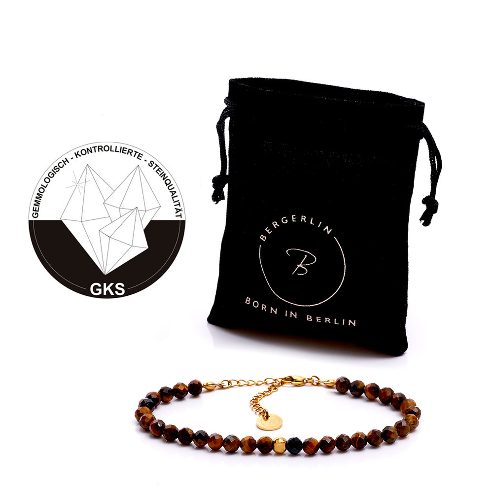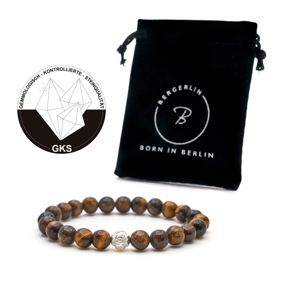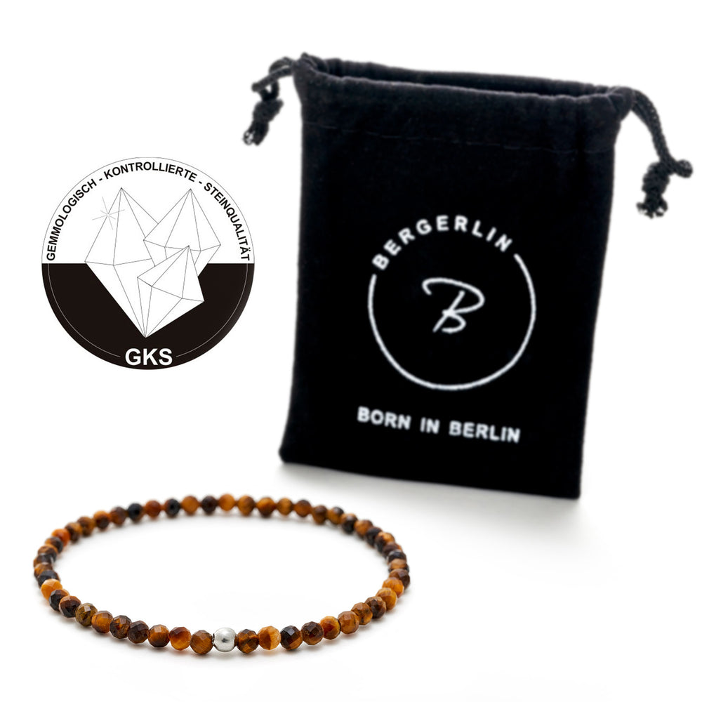Tigerauge ist ein Stein, der viele Eigenschaften symbolisiert, darunter Kraft, Schönheit und Selbstvertrauen. Zumindest hört man das von vielen unserer Kundinnen und Kunden, die spirituell veranlagt sind und den Edelstein Tigerauge als mehr sehen, als reines Schmuckstück. Bei BERGERLIN wissen wir selbstverständlich nicht, ob unsere Natursteine spirituelle Wirkungen mitbringen – und können dir daher auch nichts in dieser Richtung versprechen. Jedoch nutzen wir zur Herstellung unserer Armbänder echte Natursteine wie Tigerauge, die von erfahrenen Handwerkern mit höchster Sorgfalt und Liebe zum Detail gefertigt werden. Bei deiner Bestellung kannst du dich somit auf rein natürliche Vorkommen unserer Mutter Erde freuen, die nicht künstlich hergestellt wurden. Gepaart mit dem einzigartigen Armband-Design ergeben sich mit Tigerauge somit „glanzvolle kleine Wunder am Handgelenk“, die deinem persönlichen Stil eine Extraportion Besonderheit schenken können.
