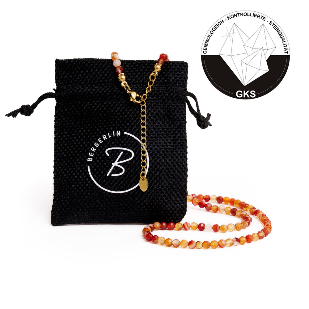 Die elegante vergoldete Perle und der fein gearbeitete Verschluss aus 925 Sterling Silber setzen einen edlen Kontrast zu den leuchtenden Orangetönen des Karneols. Ob als Talisman für neue Herausforderungen oder als Geschenk für einen besonderen Menschen – mit dieser Halskette schenkst du nicht nur Schönheit, sondern auch Inspiration, Kraft und positive Energie.